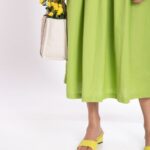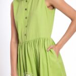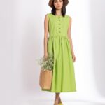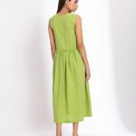 Midi dress with a wide silhouette, Round neckline with wooden buttons detailing.